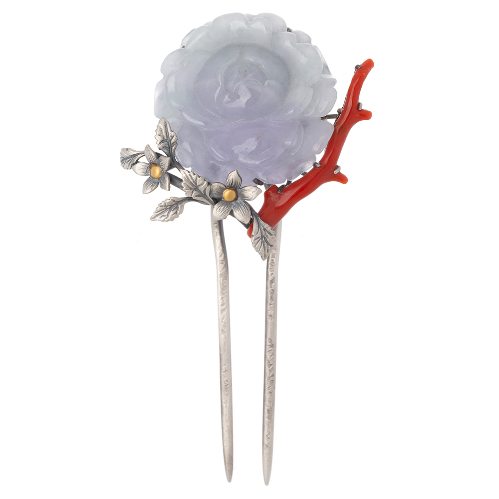 - HOME > 뒤꽂이 Dwikkoji > 나스첸카 상표 구중궁궐 뒤꽂이 > [나스첸카] 나스첸카가 피운 꽃 라벤더 비취 산호 은 뒤꽂이 공예 작품