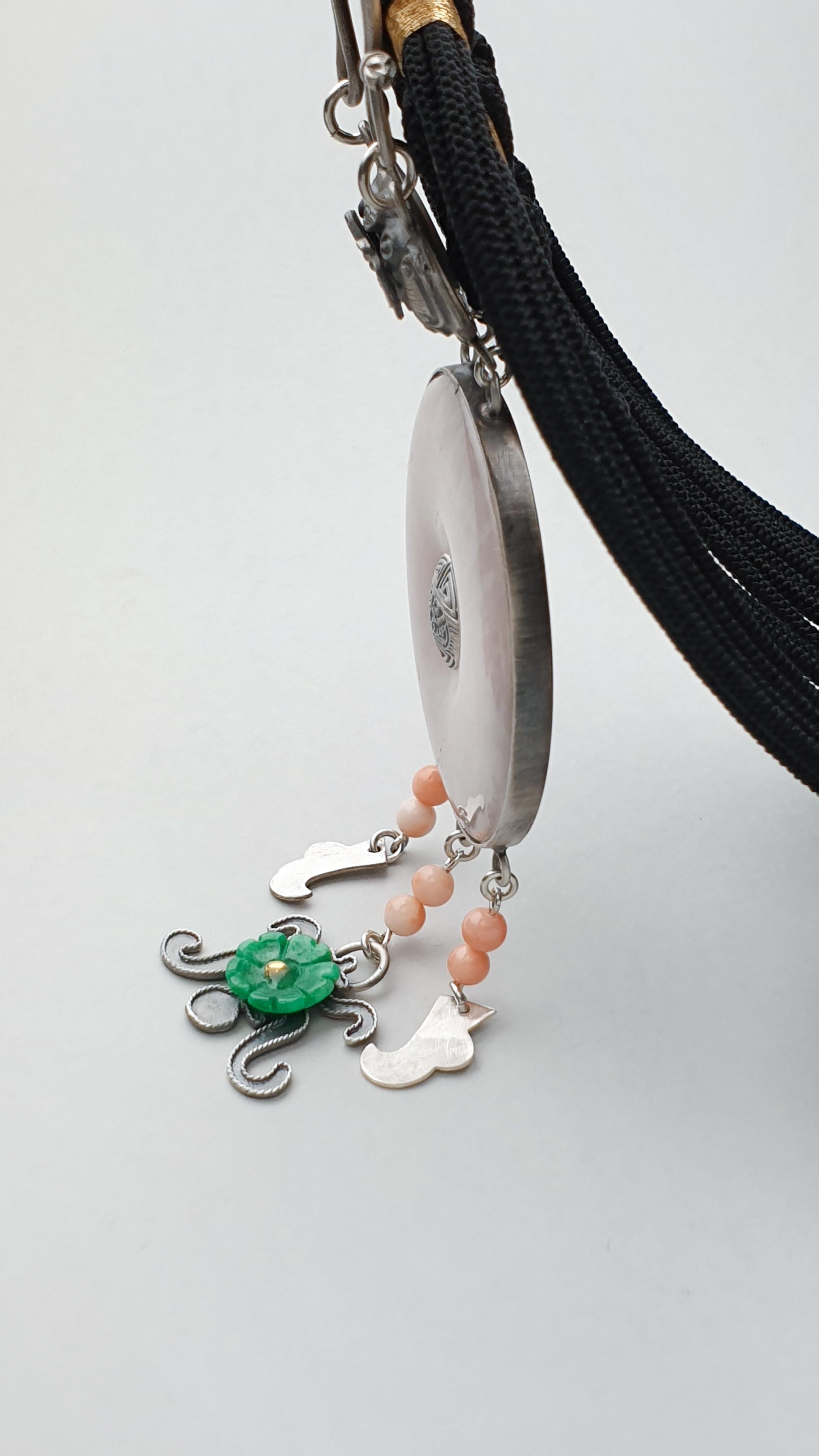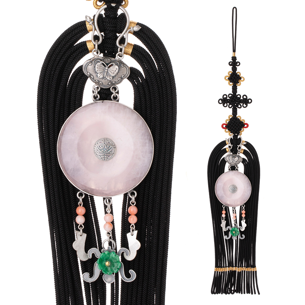 장미수정 원형 디자인에는 섬세한 나비 세공이 더해졌으며, 버선코와 진품 산호 비즈로 고급스러운 포인트를 주었습니다.