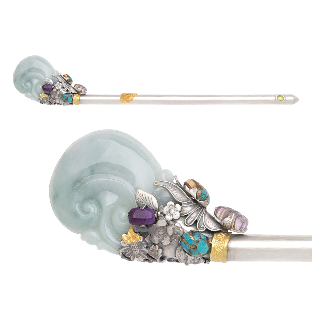 비녀대 중간 금빛 모란조각이 포인트가 되는 비녀