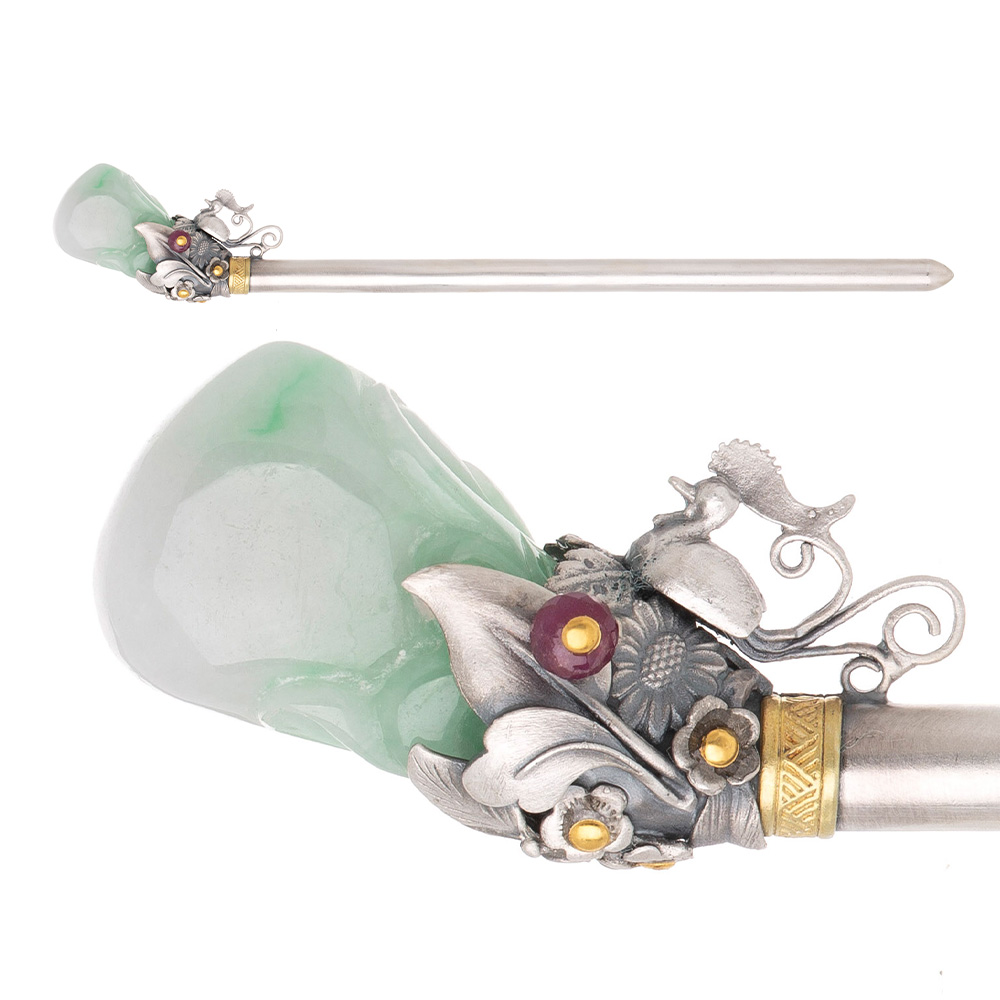 이 은비녀는 고요한 녹빛 속에 붉은 루비가 선명한 포인트로 자리하여,