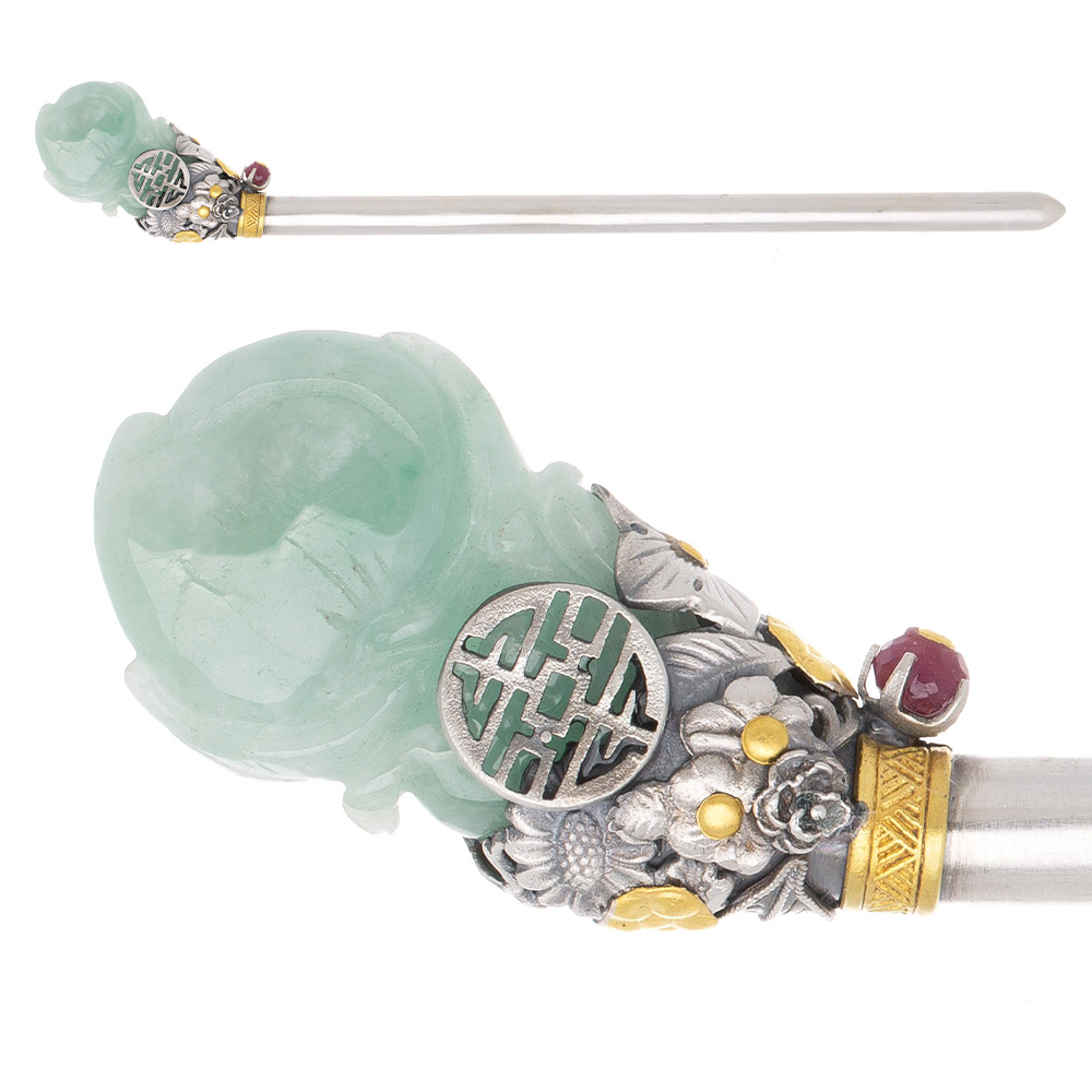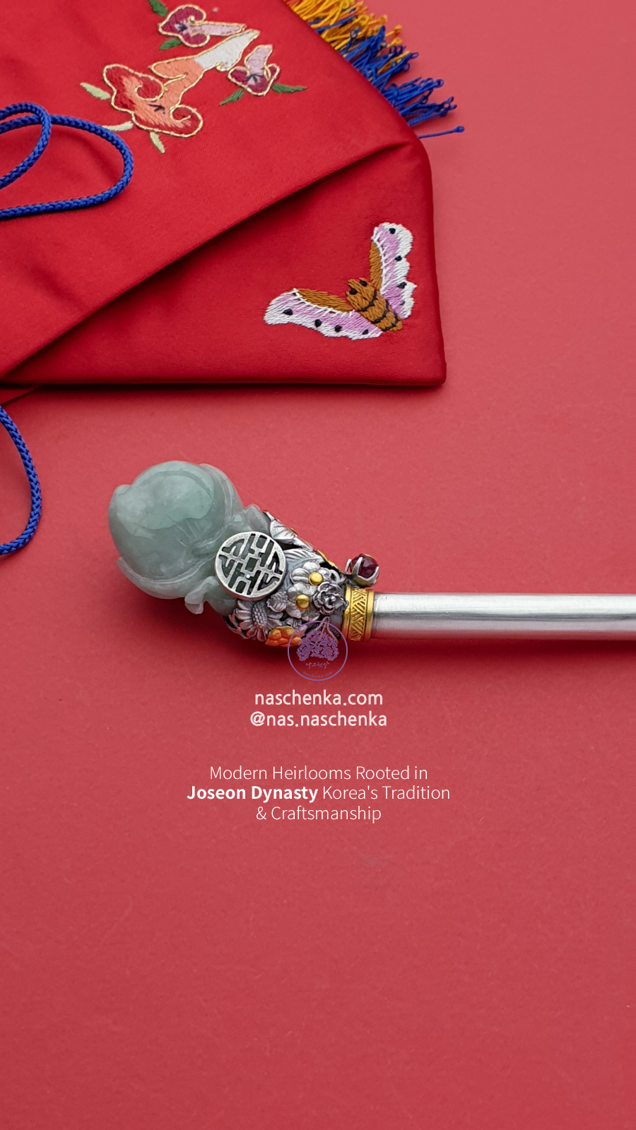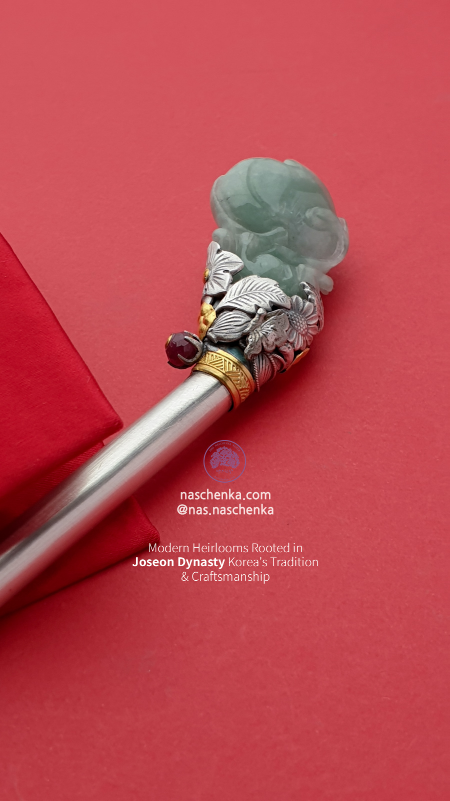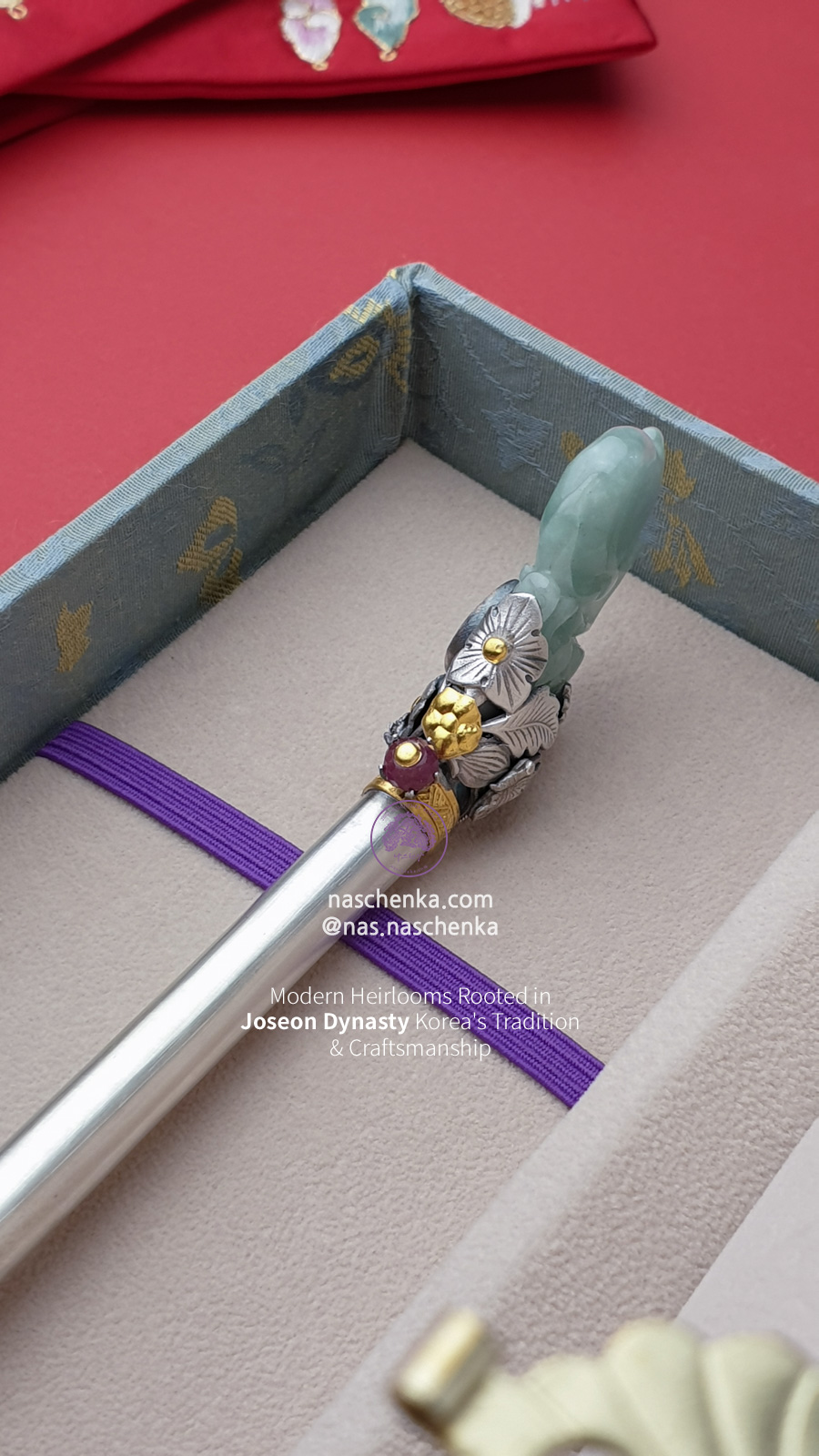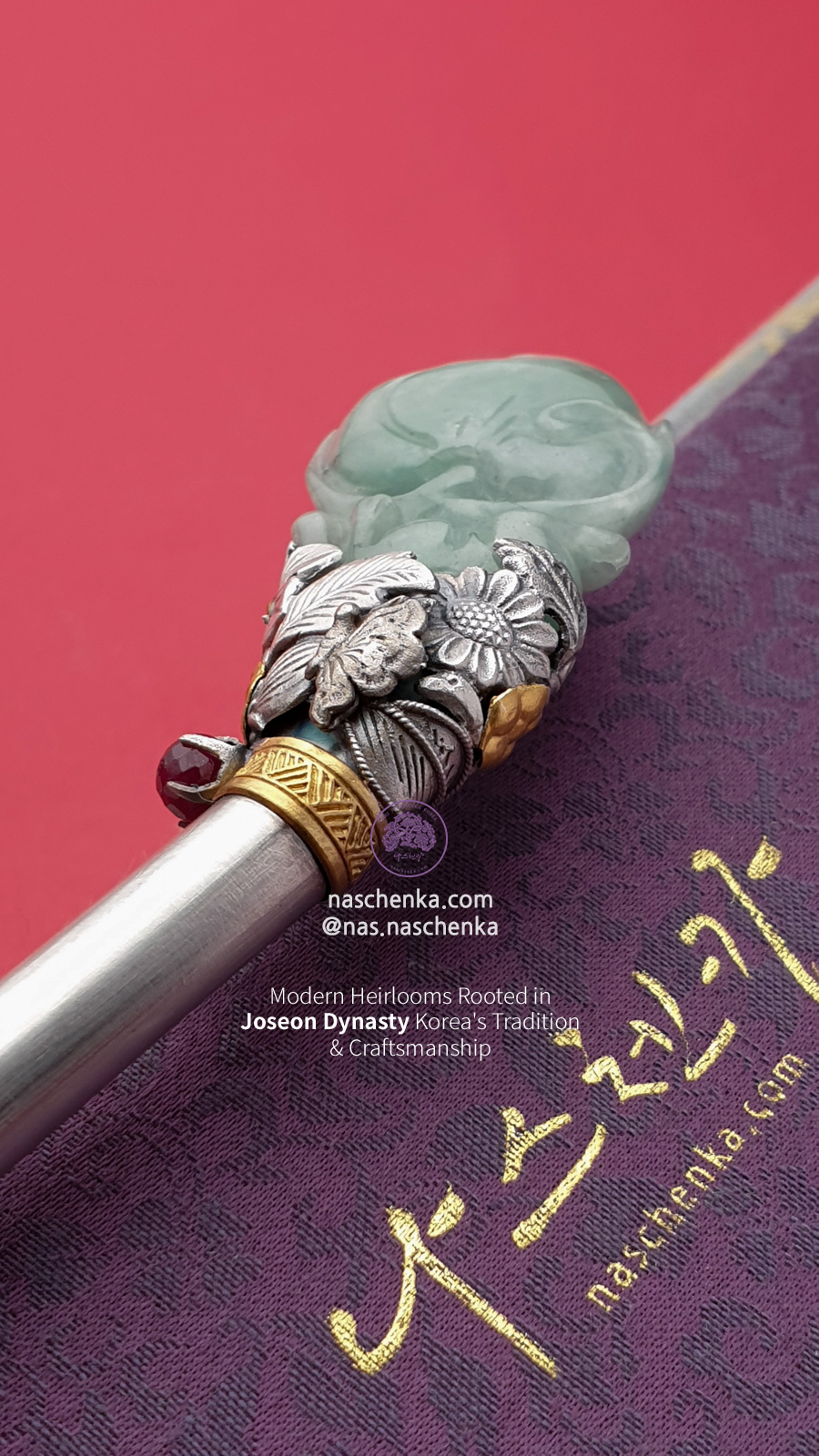 천연 비취 옥조각 + 루비포인트 꽃문양 하이엔드 은비녀 [Jade & Ruby Floral Silver Hairpin]