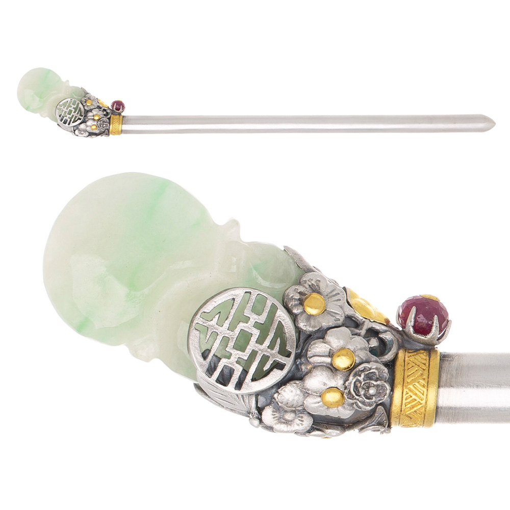 천연 비취 옥조각 + 루비포인트 꽃문양 하이엔드 은비녀 [Jade & Ruby Floral Silver Hairpin]