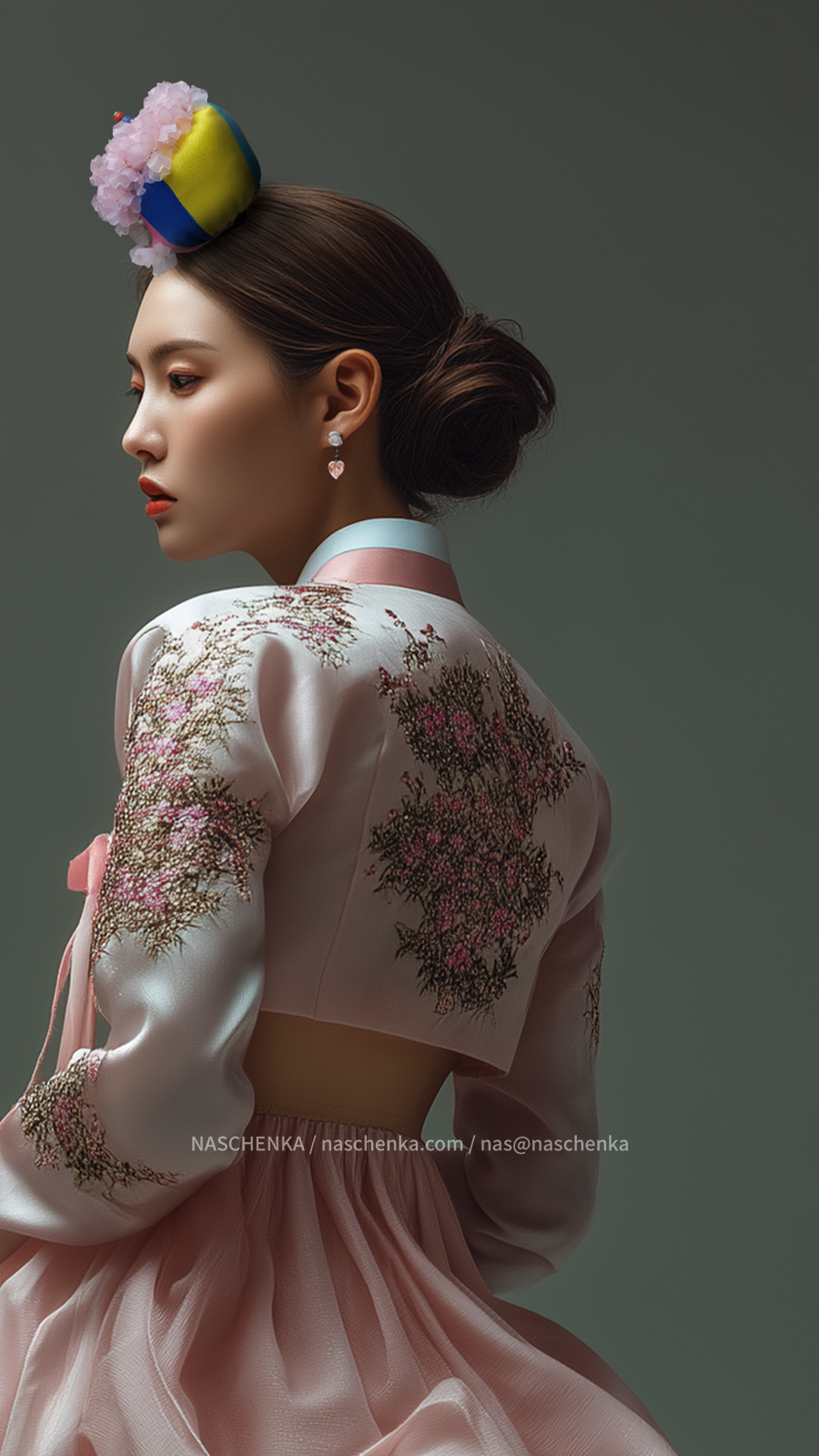 화사하면서도 단아한 색감이 한복 스타일을 고급스럽게 빛내며,