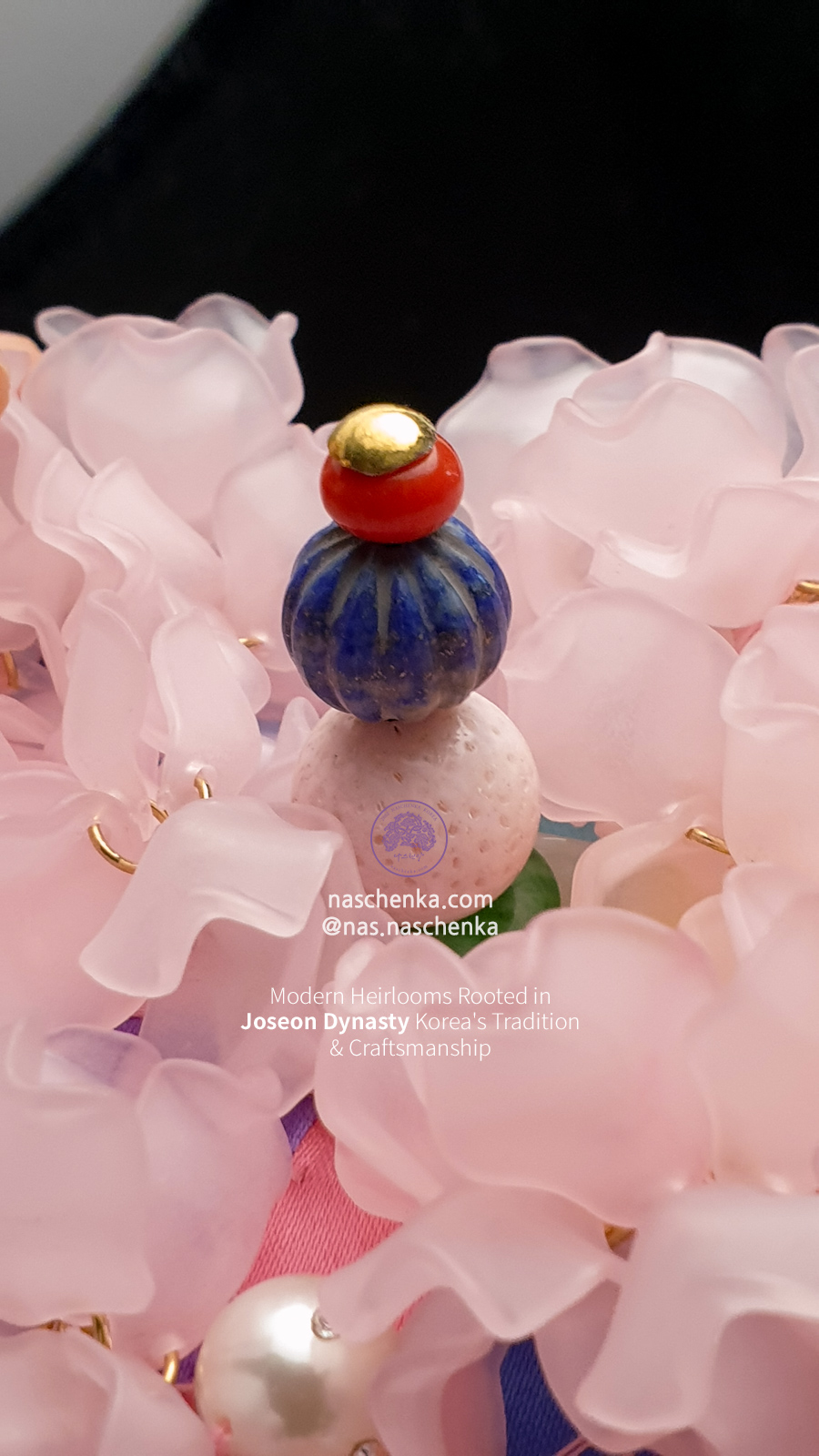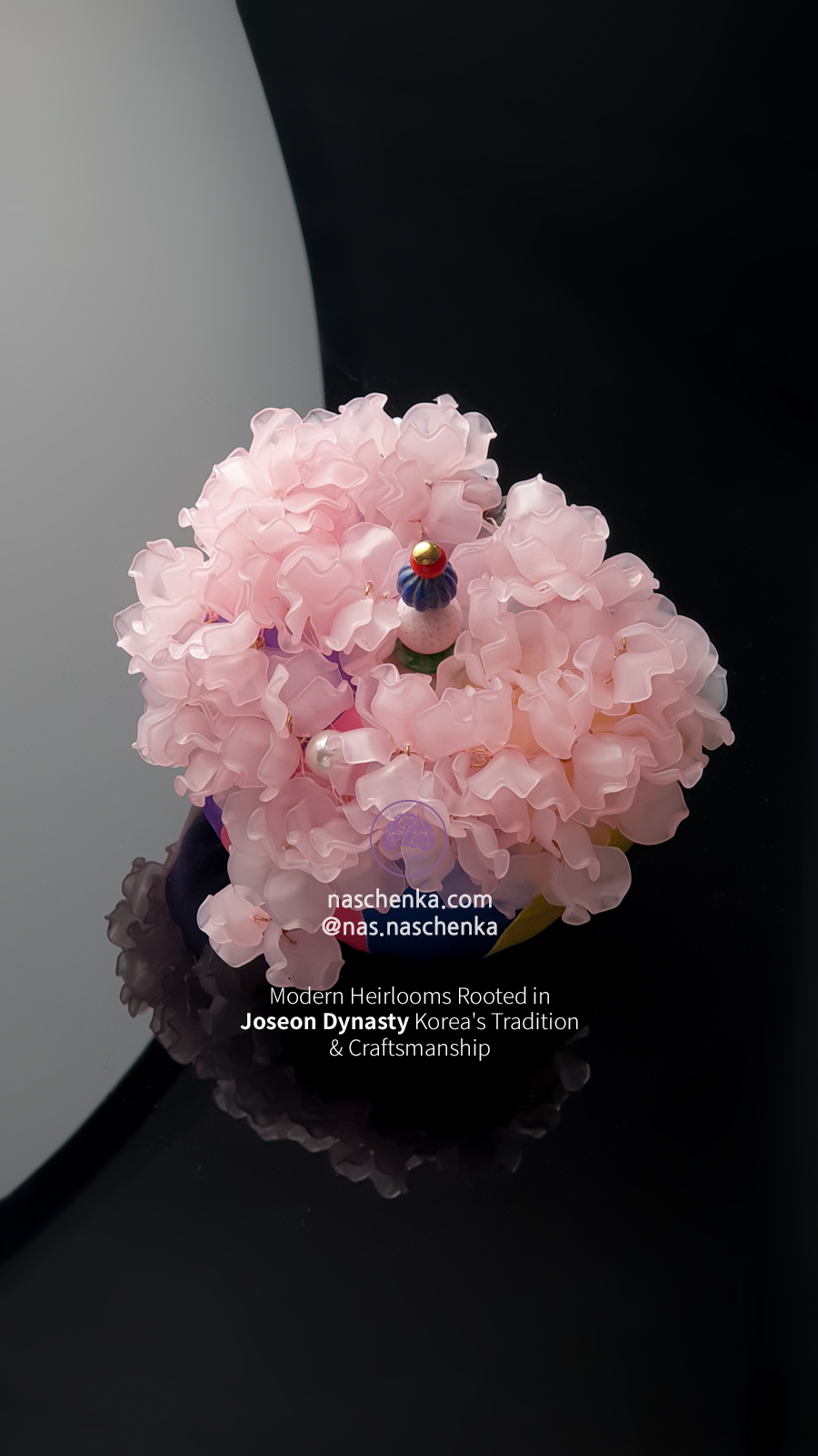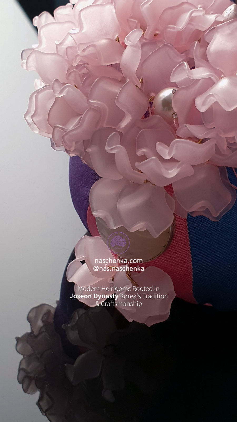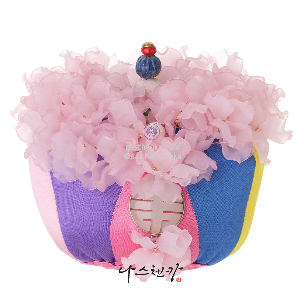 전통 색동 원단 위에 풍성한 핑크빛 꽃잎을 수공으로 한 송이씩 엮어 완성한 나스첸카의 색동 족두리입니다.