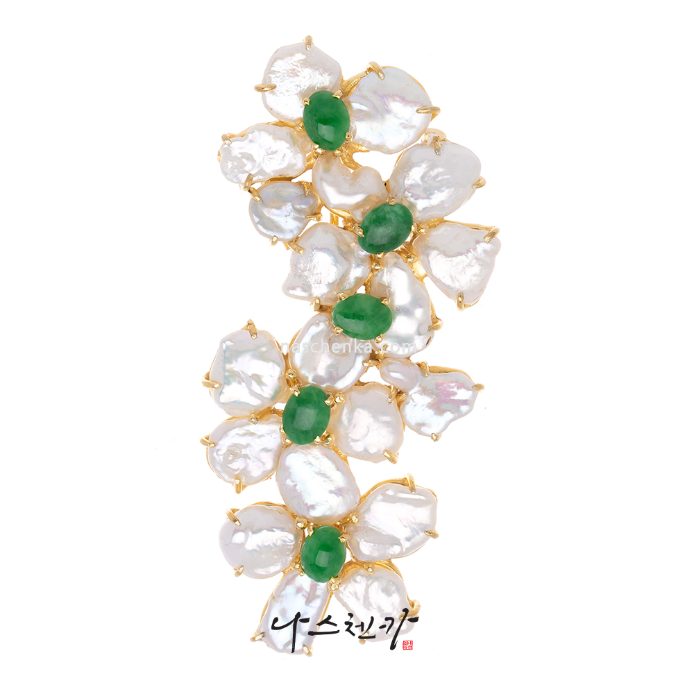 프리폼 진품진주와 쨍한 비취의 조화가 두드러지며