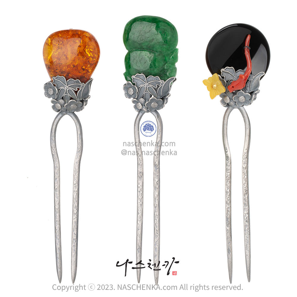 [나스첸카] 그리움 시선 14 _ 비취 산호 호박 삼작 은 뒤꽂이 전통공예 작품 Dwikkoji