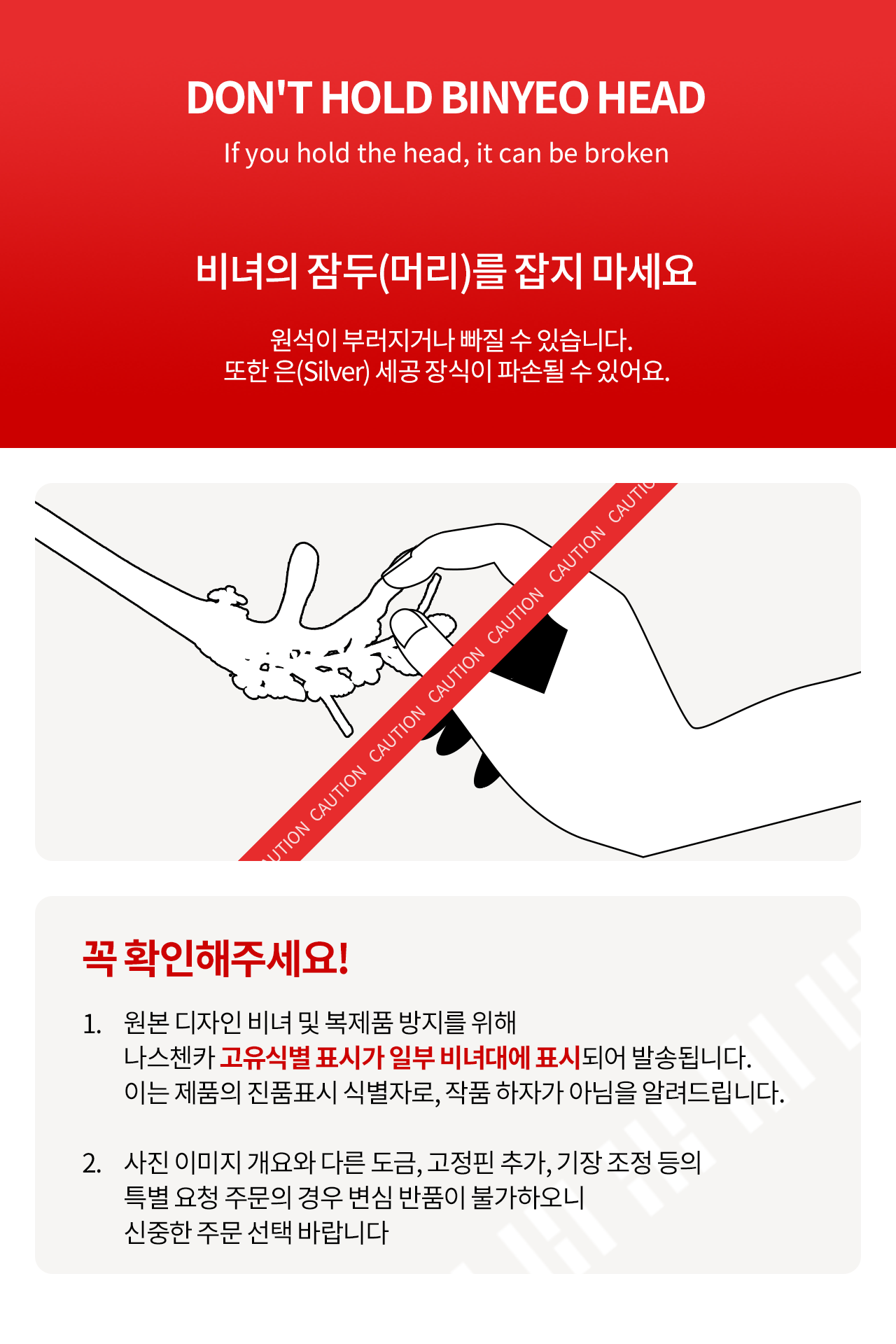 인조 머리카락은 소모품으로 AS는 불가합니다.AS 불가 원석, 통팔찌, 매듭, 노리개, 케이스 등 각종 파손 및 세공 분실 그 외에 원석 재고가 없는 경우, 제작 장인이 없는 경우, 구매 후 3년이 지난 제품, 판매된 원본 제품이 아닌 경우(고객 임의로 자체 변형 및 세공부분 분실)에도 AS가 불가능합니다. 원석 교체 요청 제품의 균형과 원작 의도를 해치는 교체는 불가합니다. 비녀대 교체 별도 문의