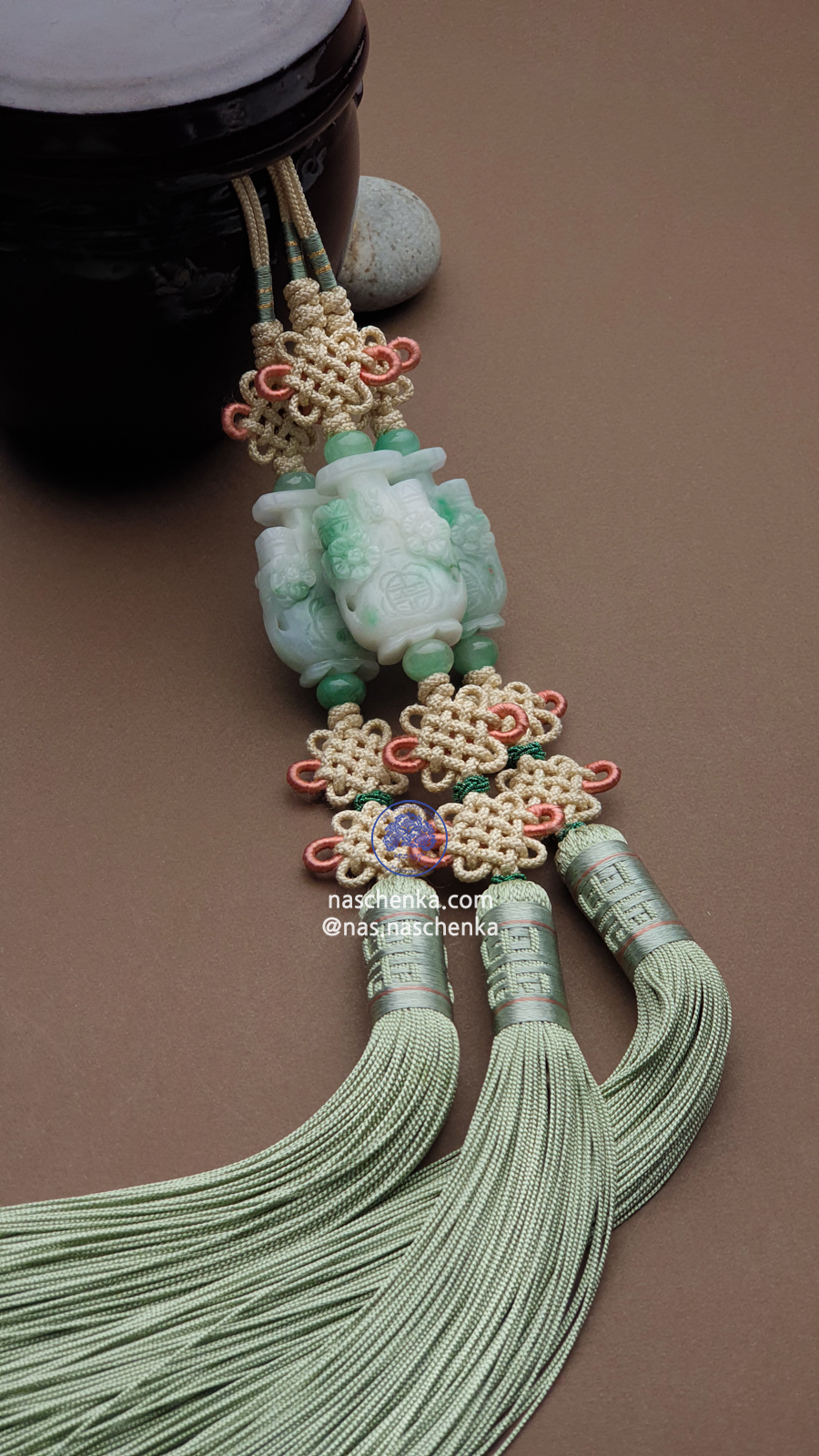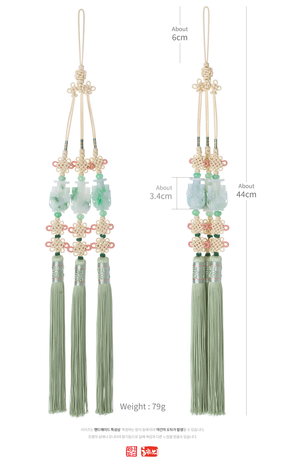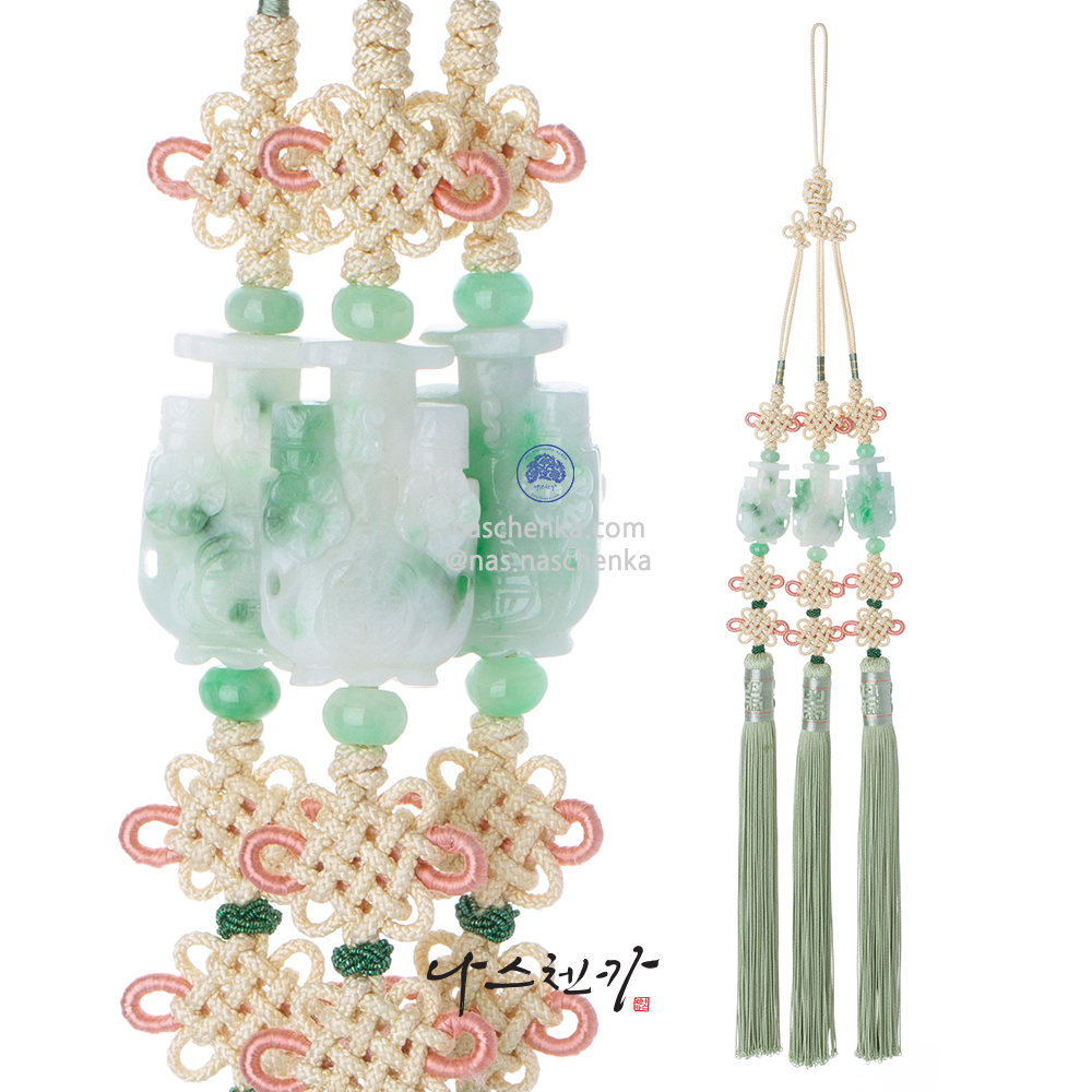 - HOME > 노리개 Norigae > 투호 노리개 > [나스첸카] 비취 투호 삼작으로 다채로운 명주실 비단 전통매듭 노리개