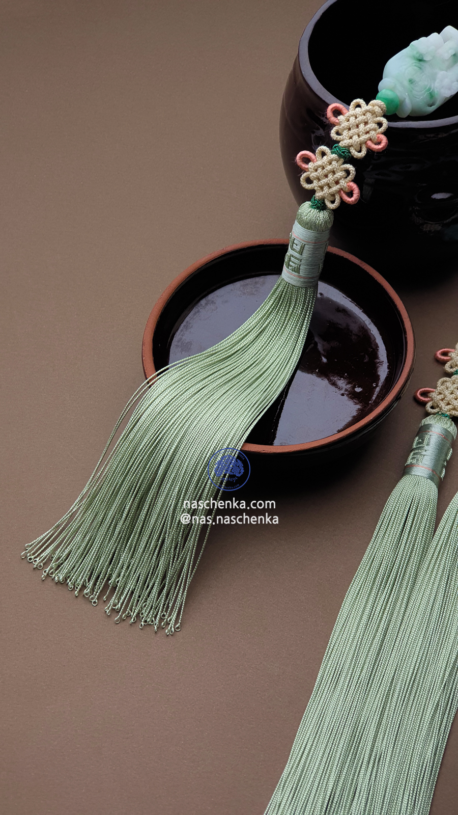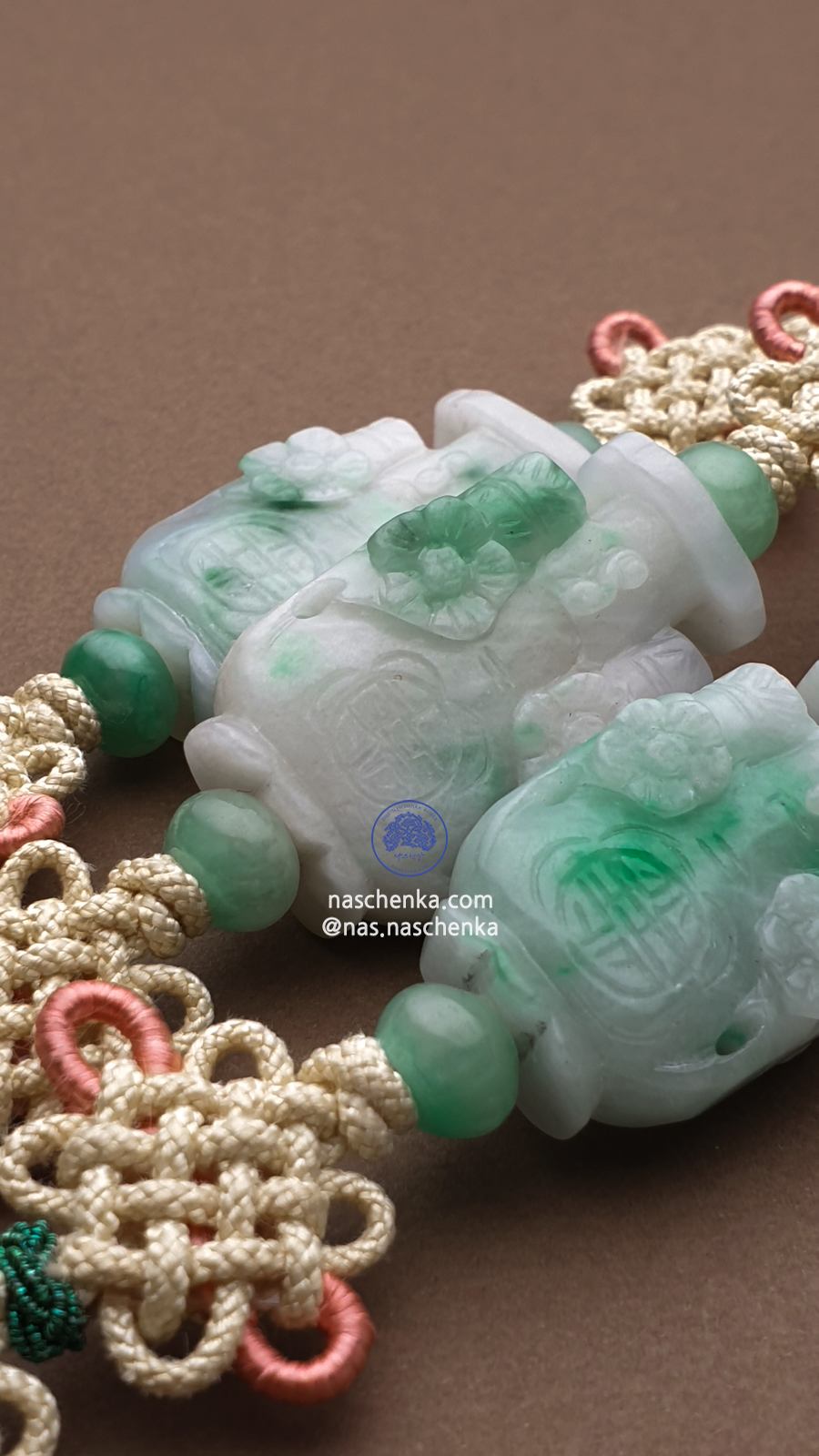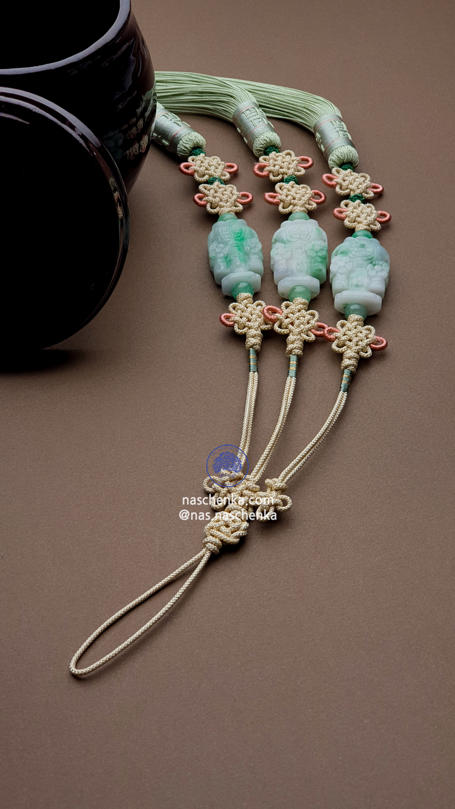 - HOME > 노리개 Norigae > 투호 노리개 > [나스첸카] 비취 투호 삼작으로 다채로운 명주실 비단 전통매듭 노리개