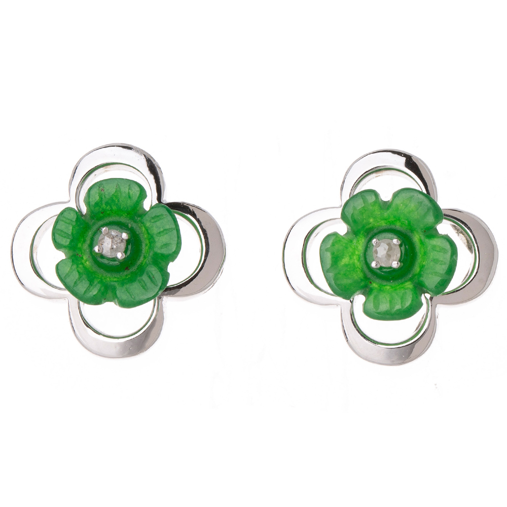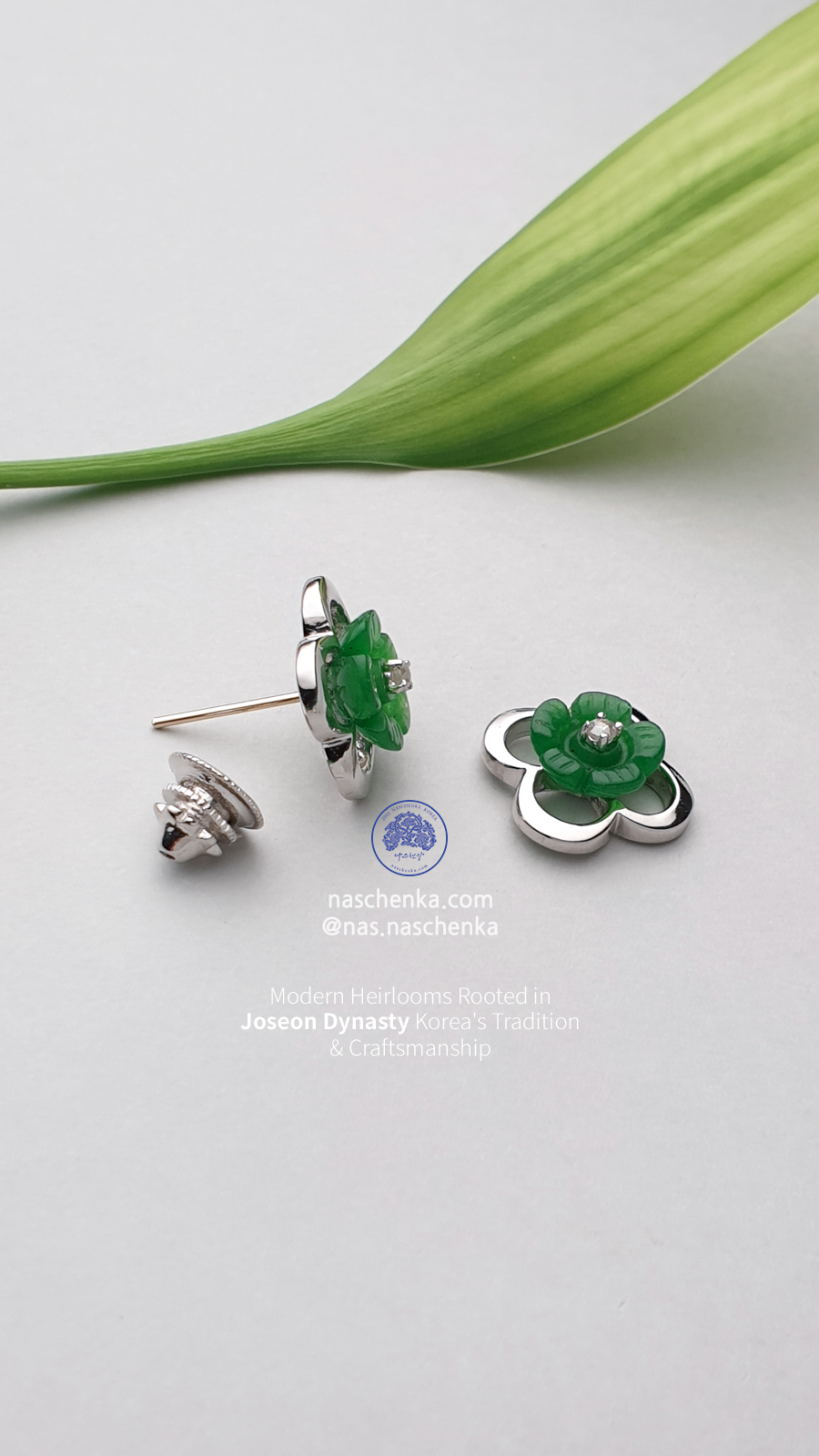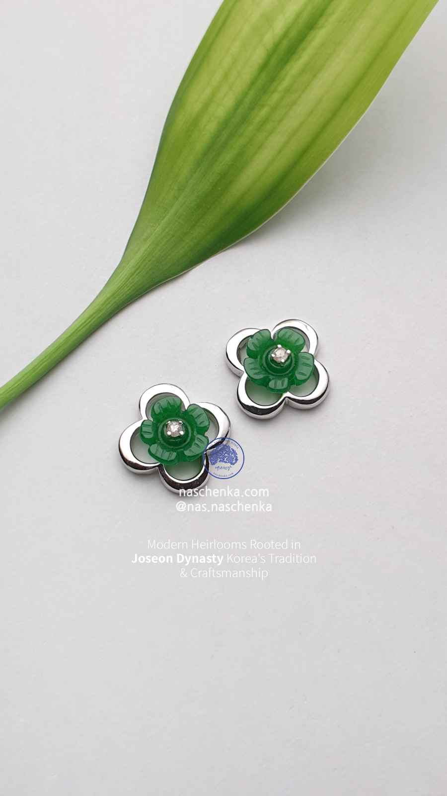 초록빛이 상큼하게 살아 있는 꽃 조각 위에, 러프 다이아몬드가 은은히 빛납니다.