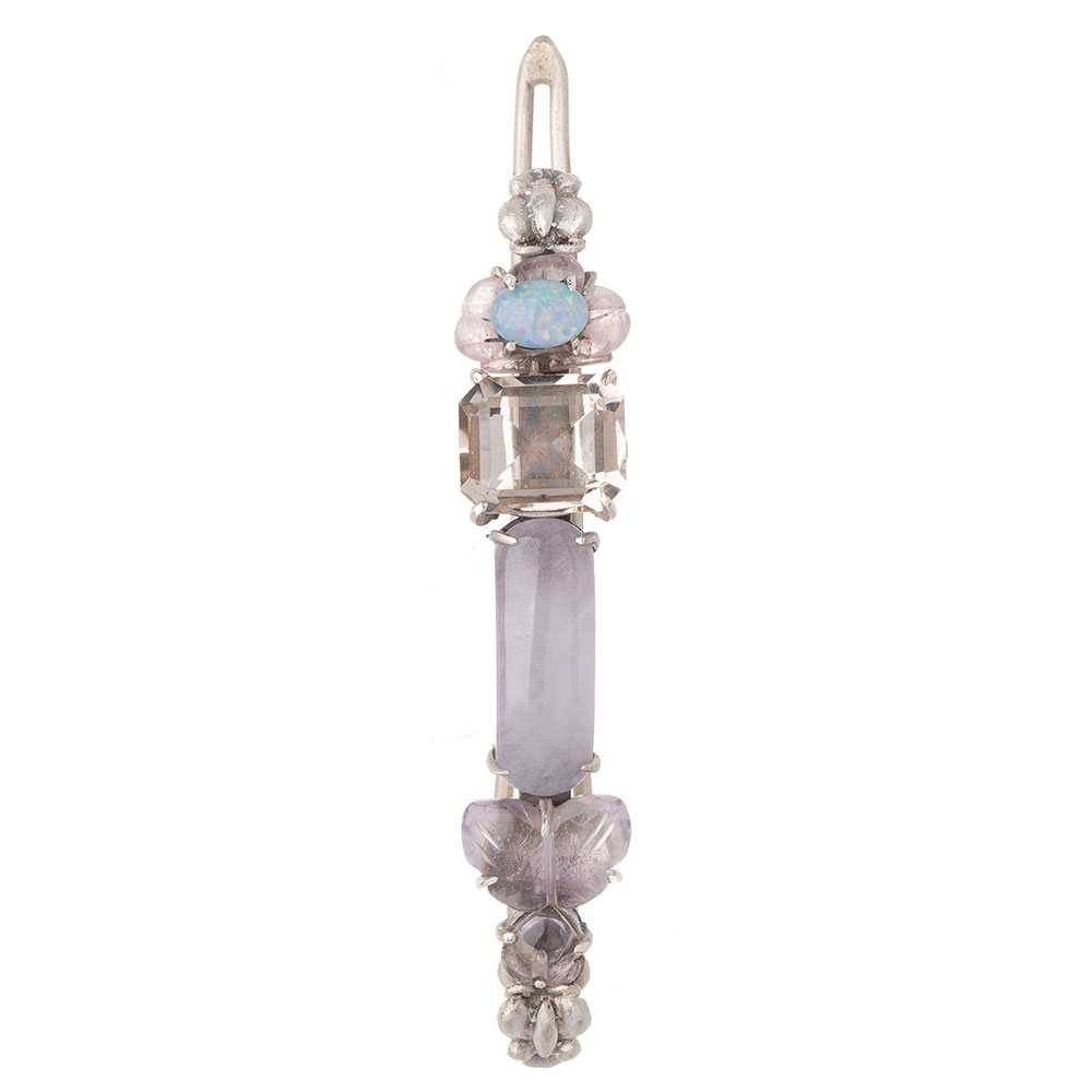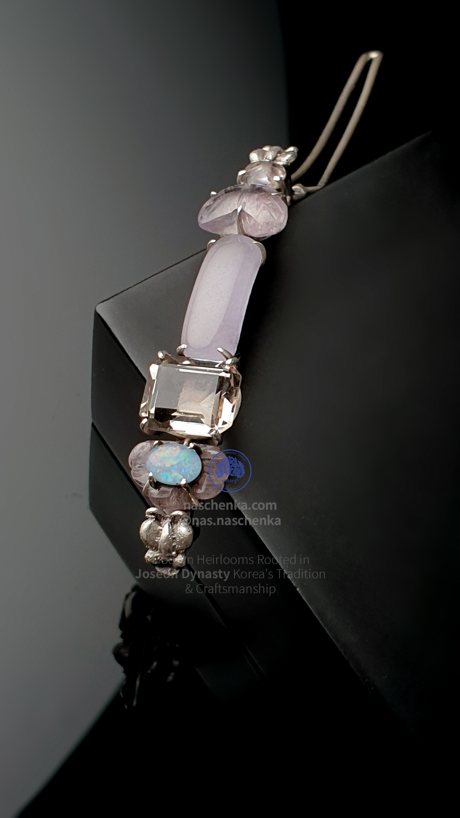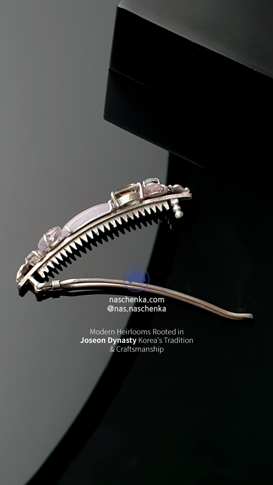 양쪽에는 자수정으로 세공된 나비 장식 두 피스가 균형 있게 배치되었습니다.