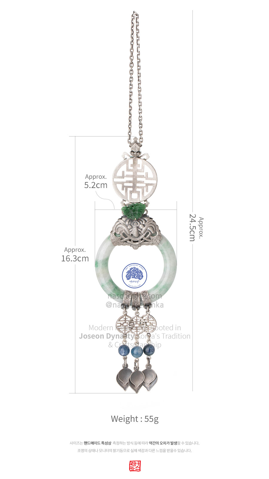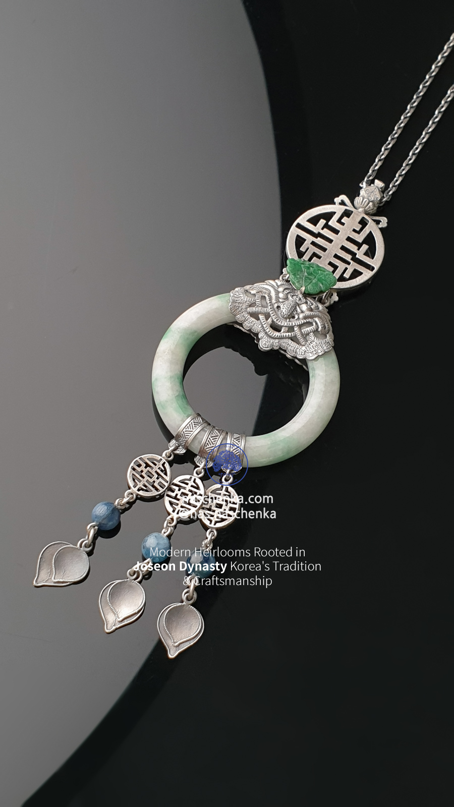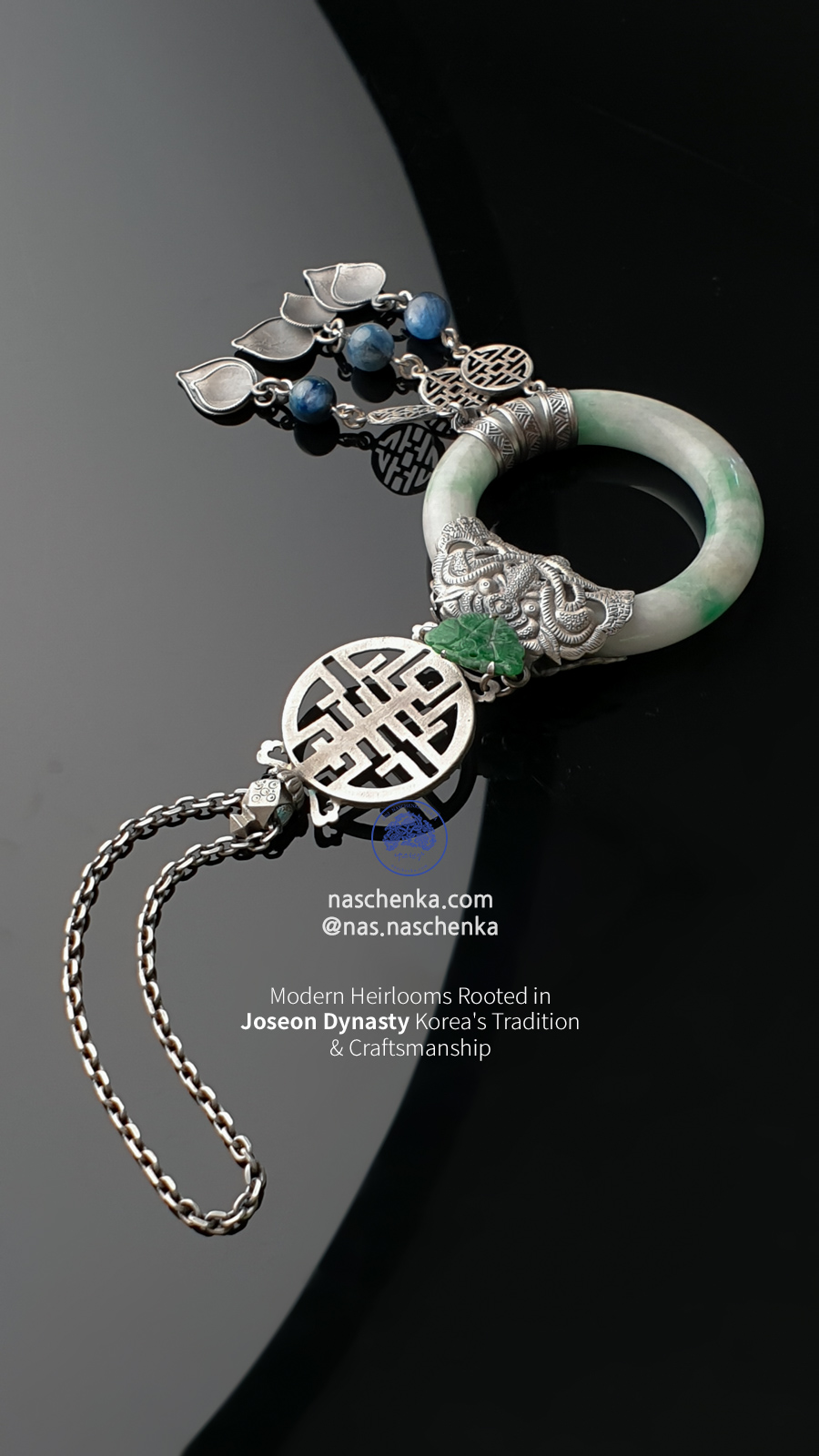 이 작품은 전통 노리개, 팬던트, 가방 참 등 다양한 방식으로 활용할 수 있는 다목적 하이엔드 장신구입니다.