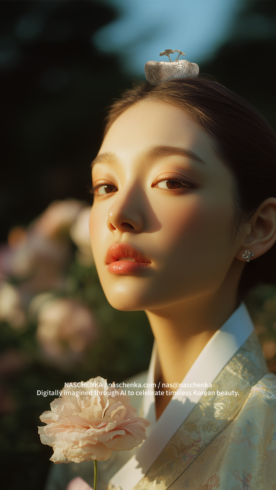 정수리를 우아하게 장식하는 두 개의 떨잠이 사랑스러움을 더하며,