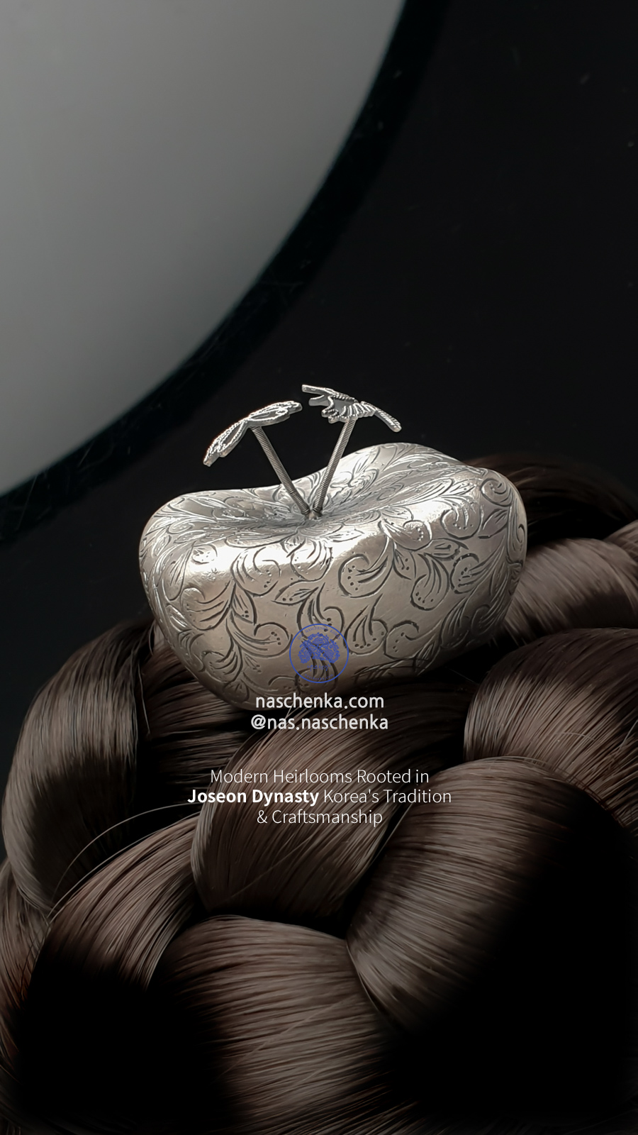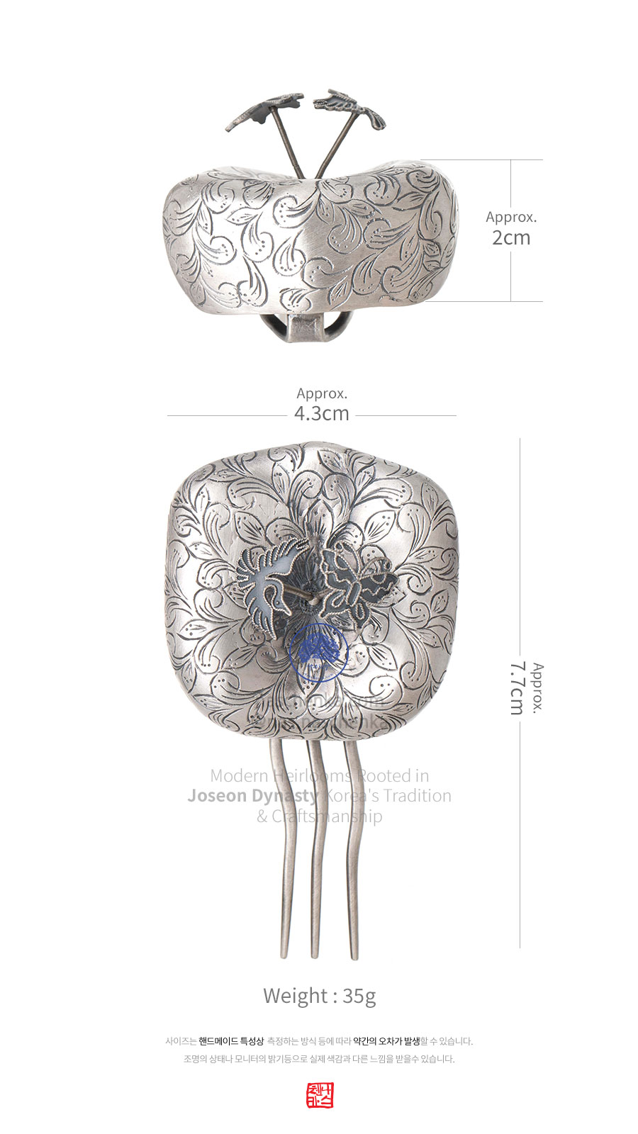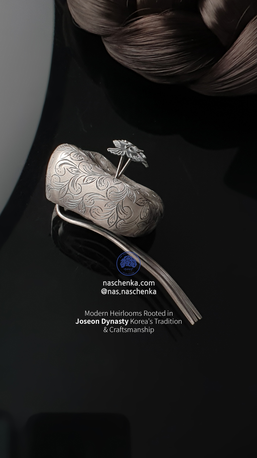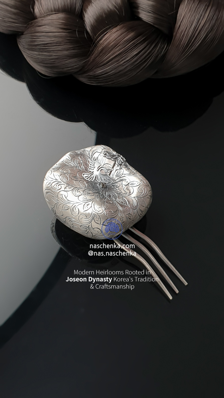 이 작품은 조선 왕실의 전통 장신구를 현대적으로 재해석한 하이엔드 전통 은공예 헤어피스로,