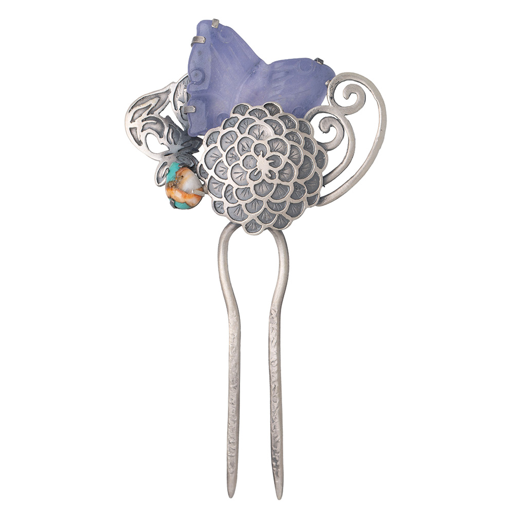 섬세한 은 세공 위에 파스텔 보라빛 염색 옥 나비와 처리 터키석(Stabolized Turquoise)을 조화롭게 세팅하여,