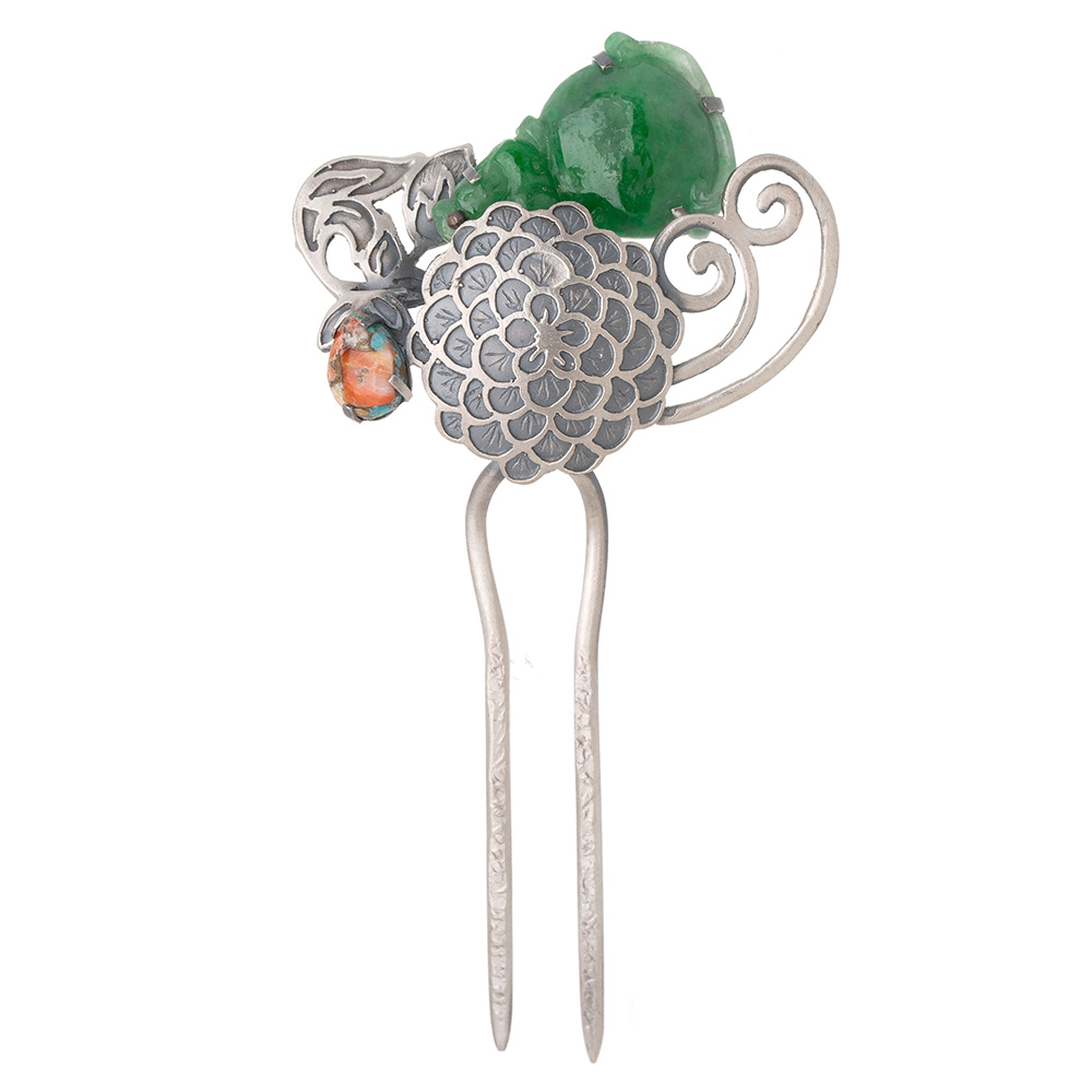 섬세한 은 세공 위에 녹빛 천연 비취(처리) 와 처리 터키석(Stabolized Turquoise)을 조화롭게 세팅하여,