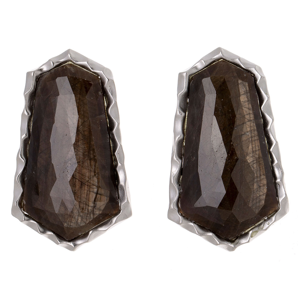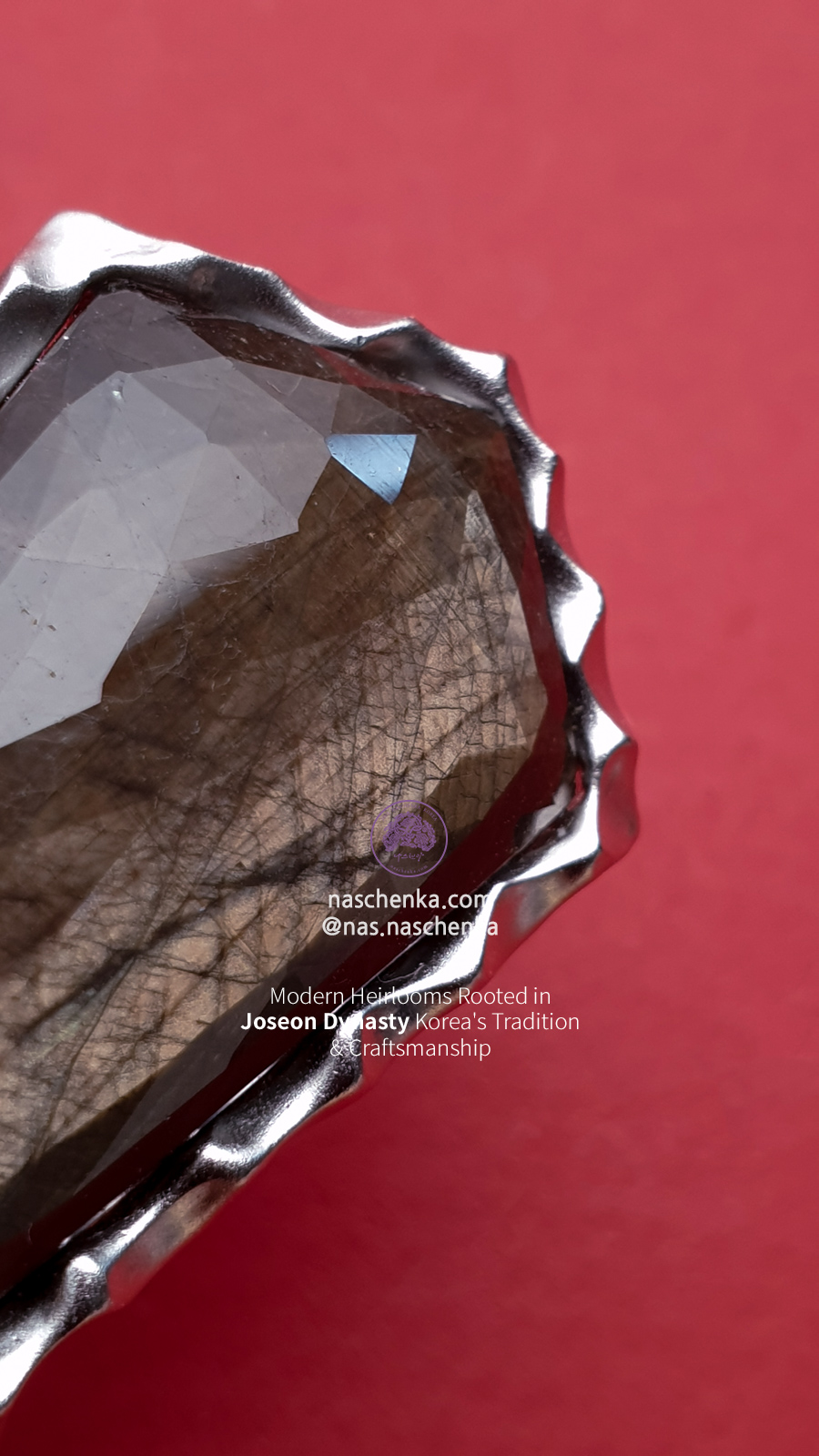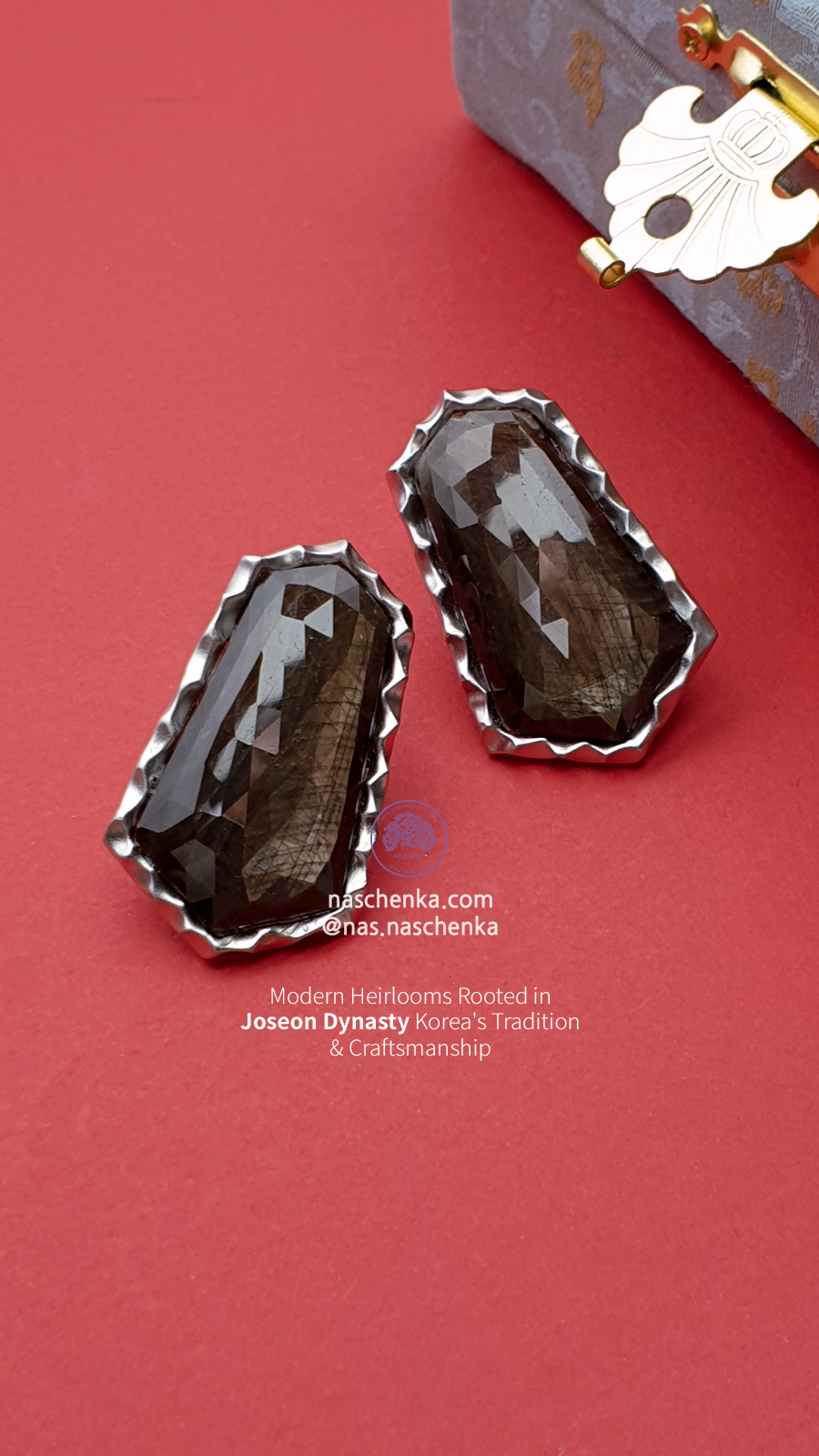은은한 딥 블랙브라운색의 사파이어가 은 세공 라인 속에서 깊이 있는 음영을 만들어내며,
