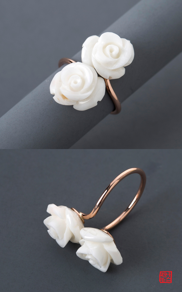 광택 우수한 최고 등급의 천연 백산호에 장미 꽃을 조각한 이 반지 -