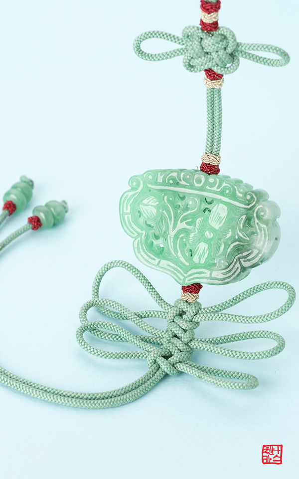 비취를 장식하는 이 매듭은 손끈목 매듭으로, 명주실입니다.