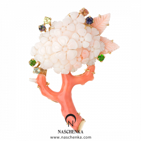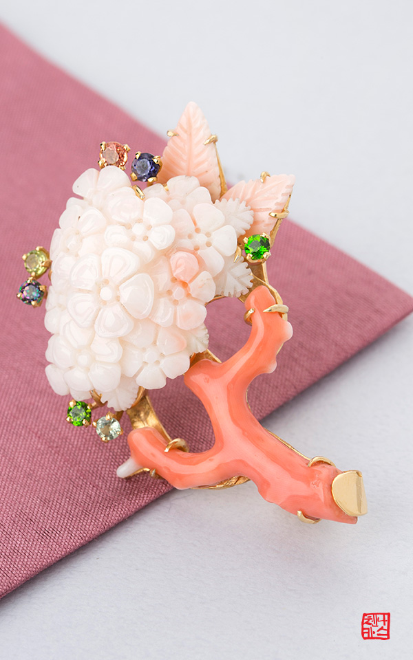 천연 산호, 보조석(사파이어, 크롬디옵사이드 등), 전체 은(silver 925) 핸드메이드 공예작품 세공 후 도금