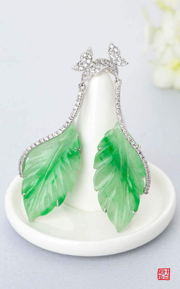 비취 나뭇잎에 사선으로 그린듯 진한 비취빛이