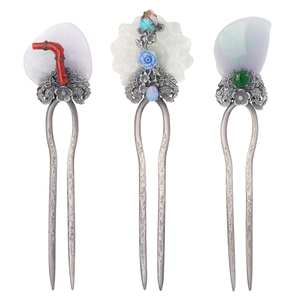 천연 산호 가지와 은은한 색감의 비취 3 피스. 진녹색의 원형 보조석 천연 비취와 , 투톤블루 합성꽃들